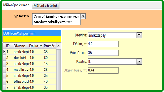Měření po kusech - dle čepové (ČSN, 1959) nebo středové tluštky (IFER, 2002)