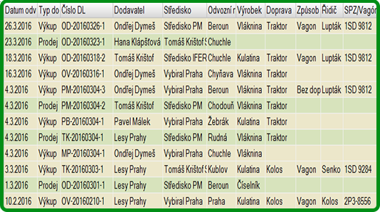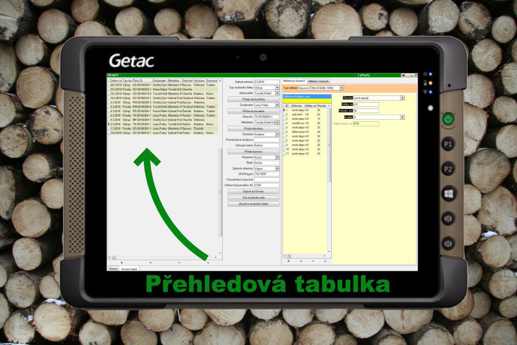 Přehledová tabulka umožňuje rychlou orientaci v jednotlivých měření. Možná je také filtrace dle všech dostupných atributů (výkup/prodej, dodavatel, výrobek, kvality výřezů, atd.) a následný export.