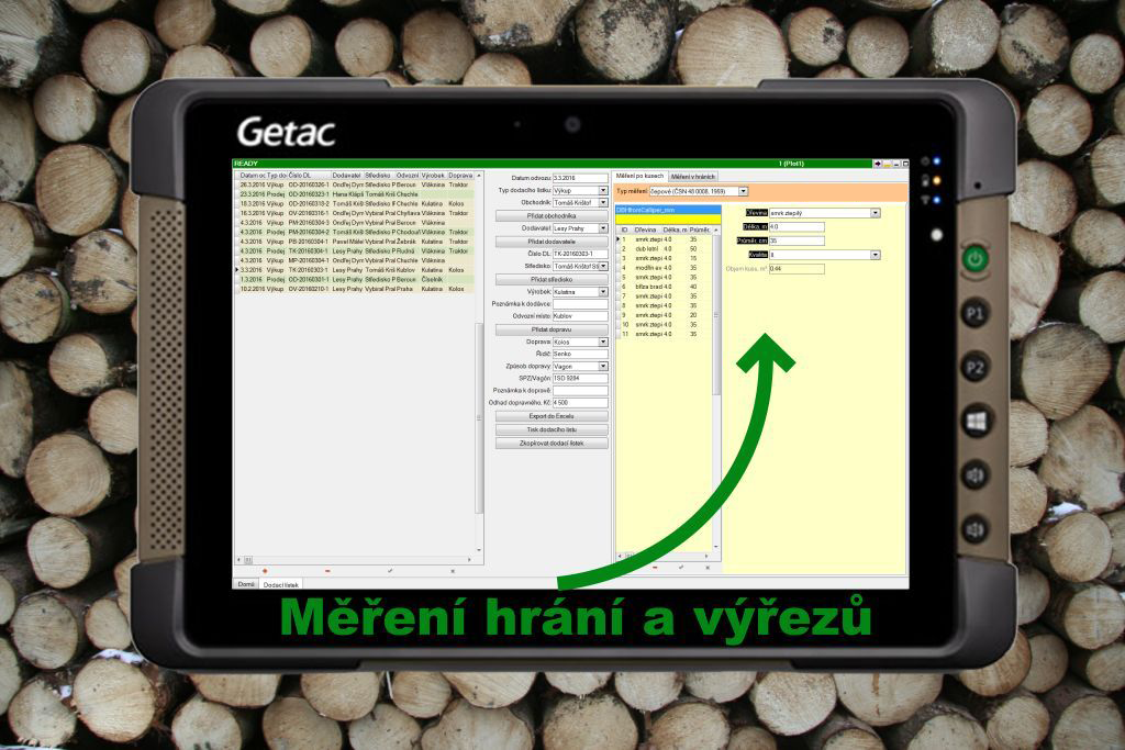 Přehledová tabulka umožňuje rychlou orientaci v jednotlivých měření. Možná je také filtrace dle všech dostupných atributů (výkup/prodej, dodavatel, výrobek, kvality výřezů, atd.) a následný export.